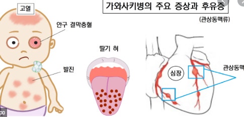 | 주요 증상 | 고열, 눈 충혈, 입술 변화, 발진, 림프절, 손발 부종 등 |