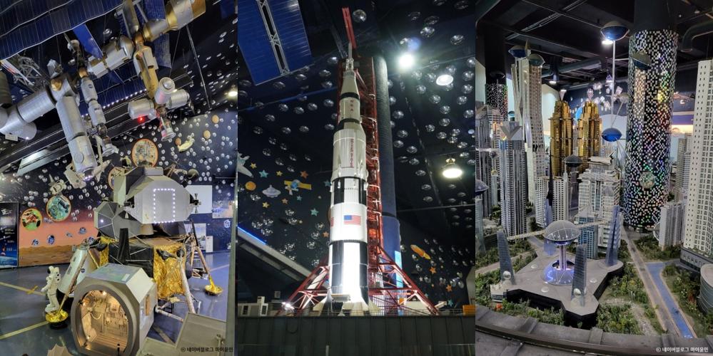 ▲ 옥토끼 우주센터 실내 전시장 전경. 위성과 우주정거장, 아폴로 로켓, SF 영화 속 같은 미래도시 모형까지 아이들의 호기심을 자극하는 전시가 가득합니다.