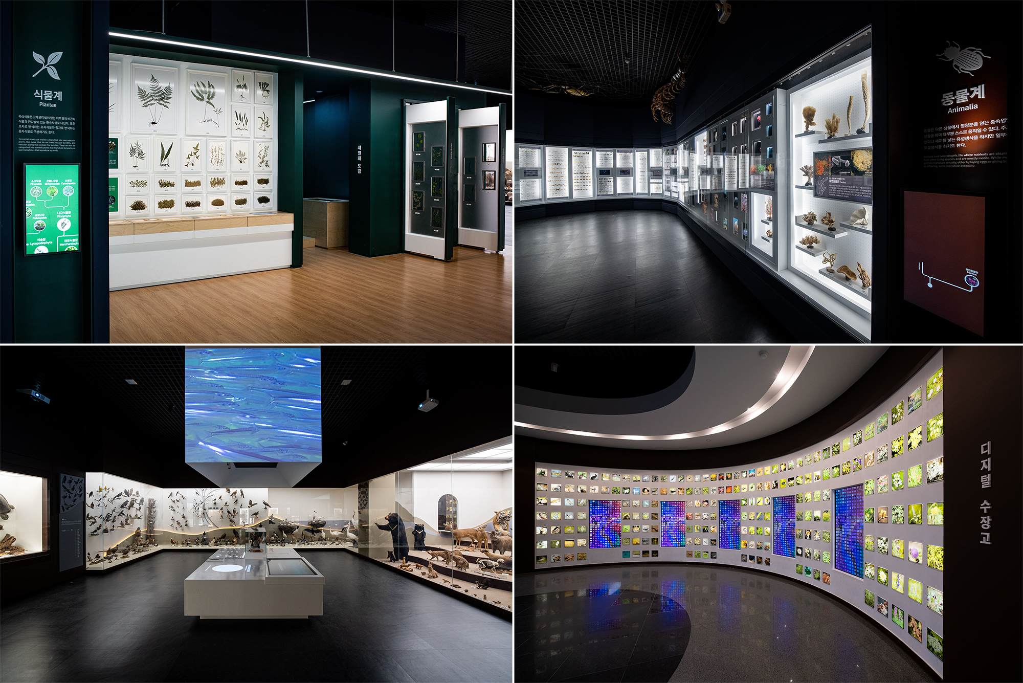 전 개인적으로 1 전시관이 제일 괜찮았어요. 생물의 고균 계, 세균 계, 원생동물계, 균 계, 유색조식물계, 식물계, 동물계 총 7계의 분류군으로 생물을 나누어 전시하고 있습니다. 식물계는 선태식물부터 속씨식물까지 세밀하게 소개하고 변색되지 않도록 처리한 특수표본을 다양하게 전시하고 있습니다. 무척추 동물계는 해면, 자포, 연체, 절지, 극피, 척삭동물(이건 처음 들어본다)등 종류와 형태가 정말 다양하게 전시되어 있고, 척추동물계는 박제형태로 어류, 양서류, 조류, 포유류 등 우리나라에 서식하는 동물을 한눈에 보실 수 있으실 겁니다. 우리나라에서 가장 많은 표본을 전시하고 있다고 합니다. 마지막 나오시는 길에 디지털 수장고가 있는데 저희 아이는 여기서만 20분 이상은 보다 나온 거 같아요.