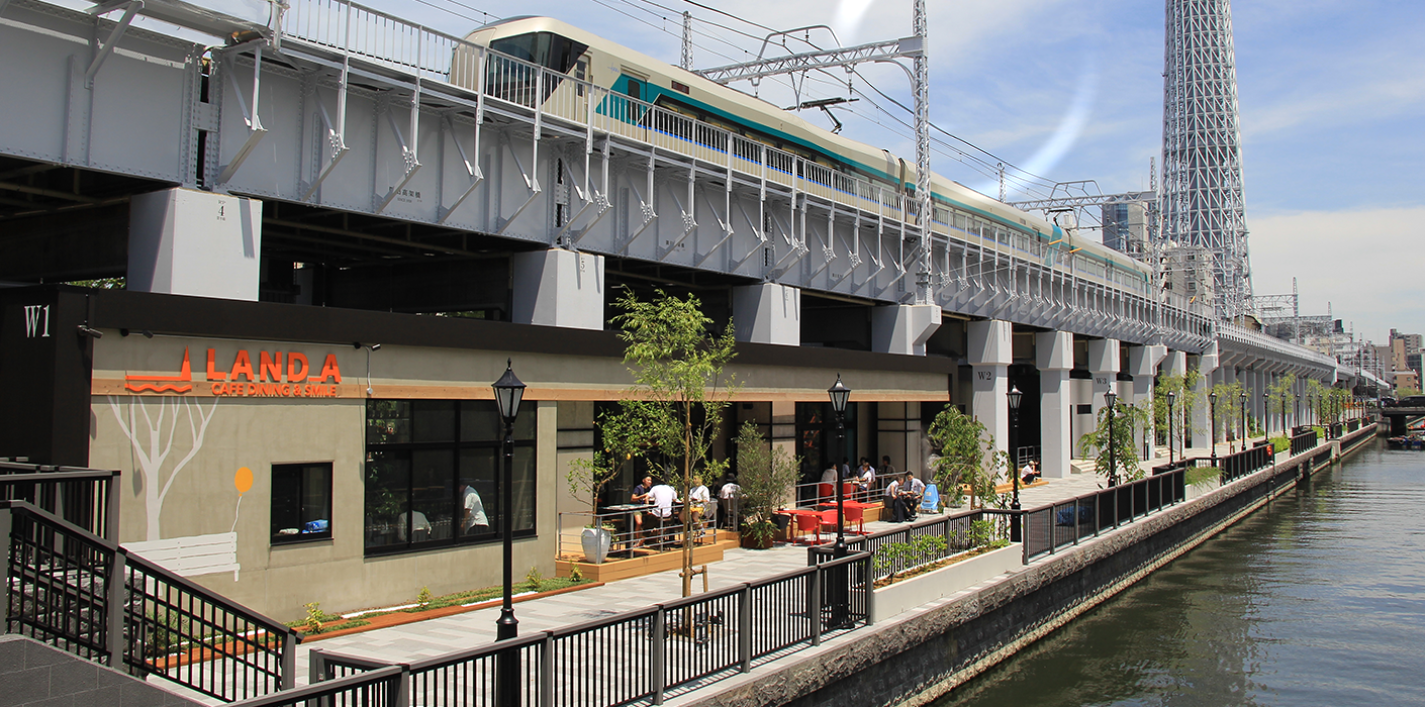 2020년 개장한 미주마치는 스카이트리와 아사쿠사를 도보로 잇는 구간에 위치한 상업 단지입니다. 도부 철도 고가 아래를 활용한 세련된 공간 구성과 강변을 따라 이어지는 테라스가 인상적이죠.
