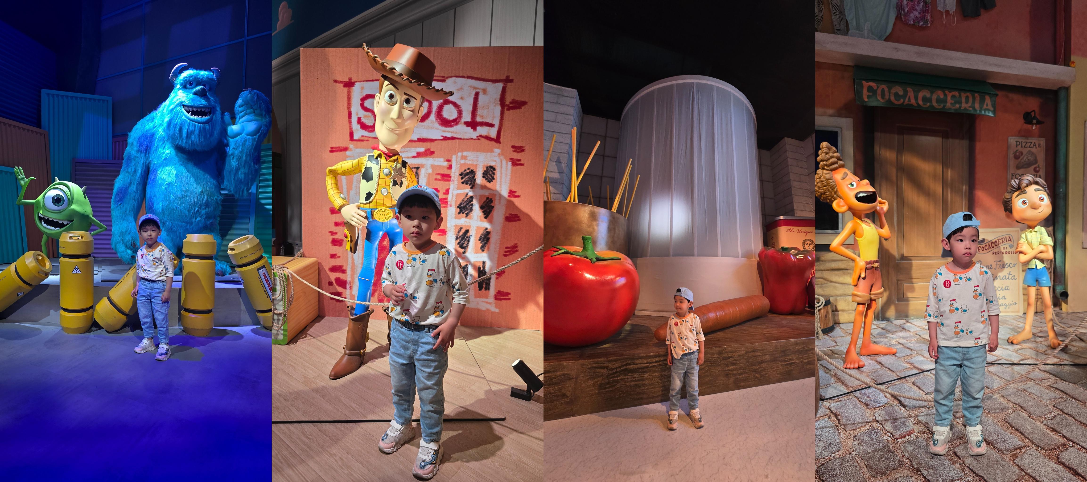 문도 픽사 전시회에서 아이가 몬스터 주식회사, 토이 스토리, 라따뚜이, 루카 존을 체험하며 촬영한 네 컷의 콜라쥬 이미지. 설리와 마이크, 우디, 거대한 토마토와 냄비, 루카와 알베르토 캐릭터가 함께 등장한다.