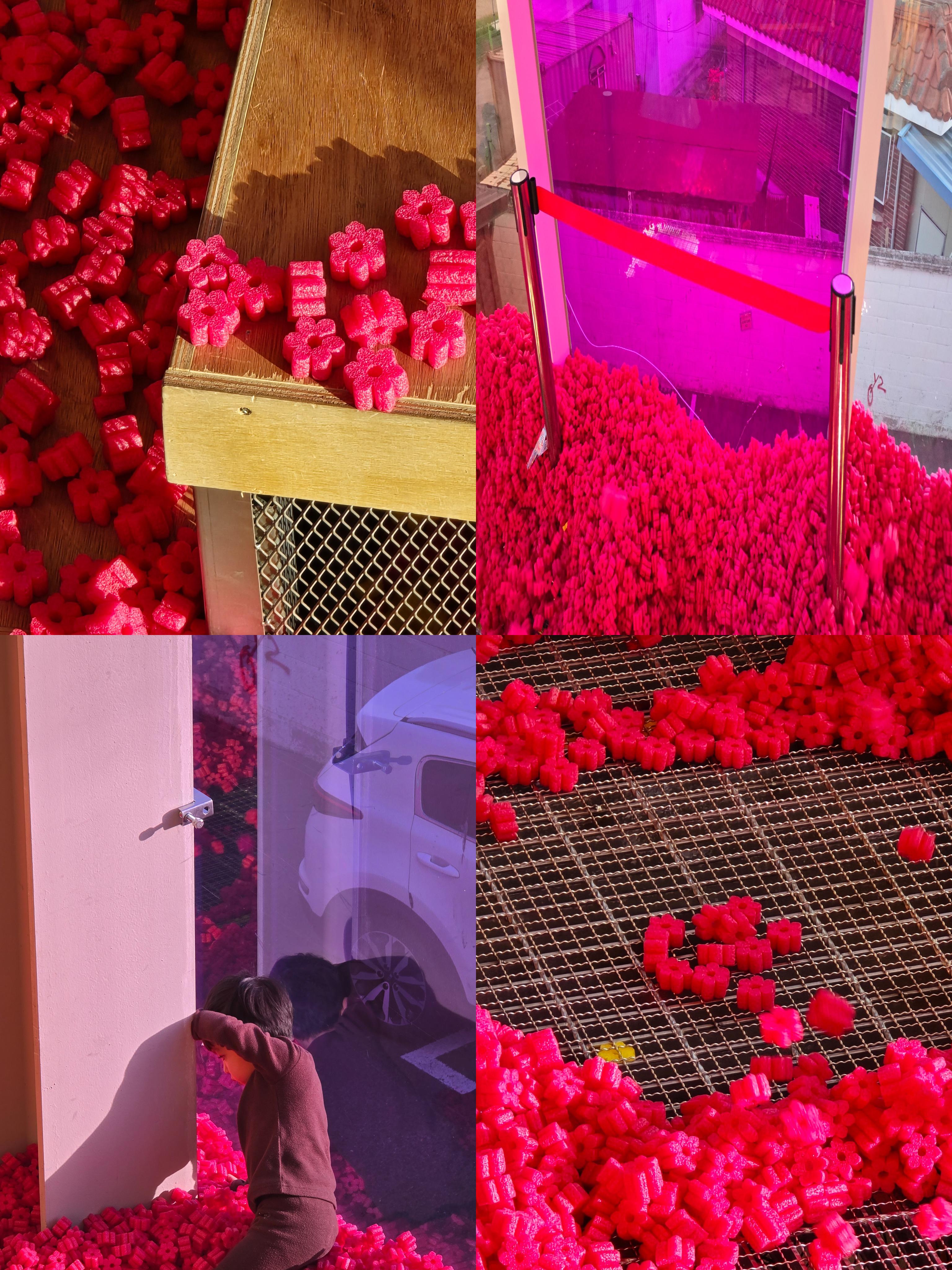 <사진 위치 - 파도 체험존, 스펀지 장난감 디테일, 붉은 공간 감성>